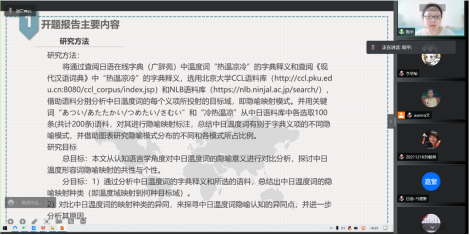 为充分了解研究生论文工作进展情况,确保2020级硕士研究生顺利完成毕业论文工作,日语系于2022年4月27日在线上举行了历时三个小时的研究生学位论文进展报告会。bat365正版唯一官网副院长、日语系学科负责人王佳音教授、日语系教师薄红昕、王晚明、文慧超、马嘉繁,以及2020级和2021级研究生参加了此次会议。